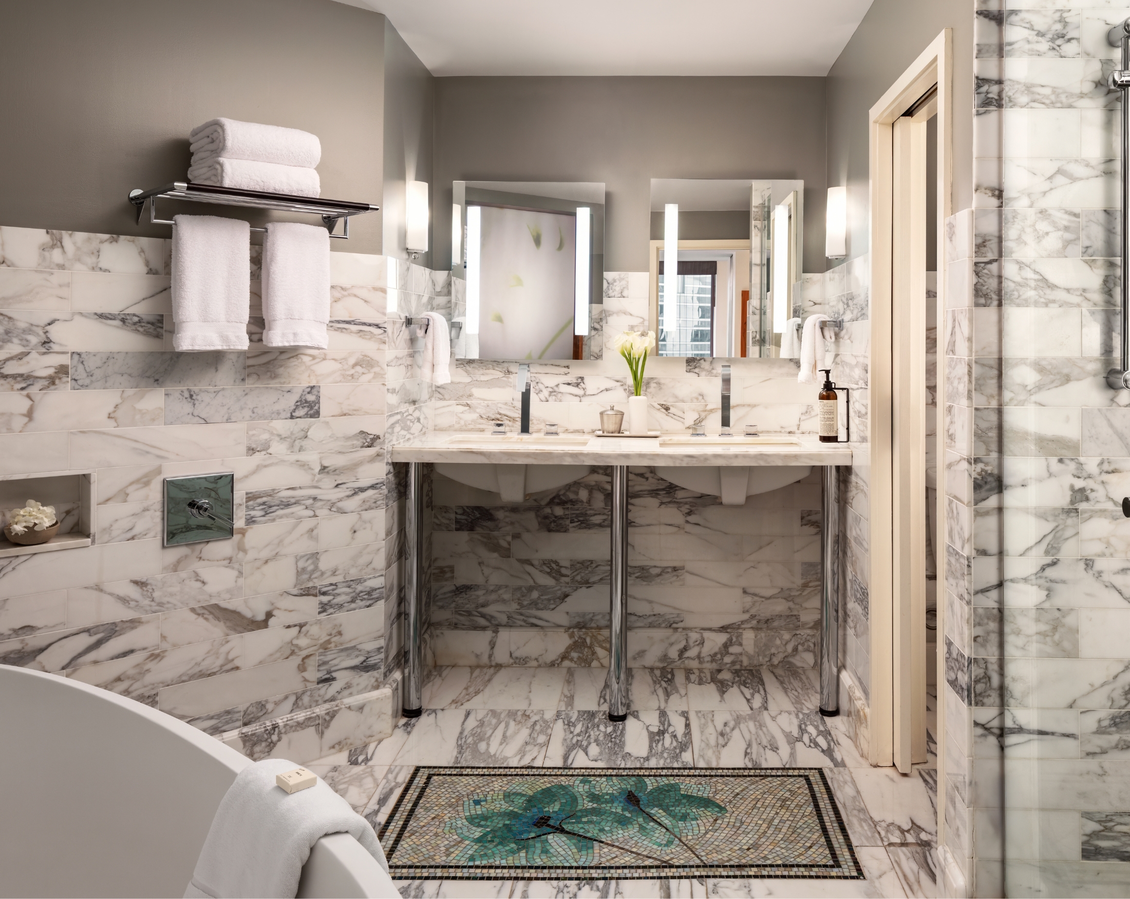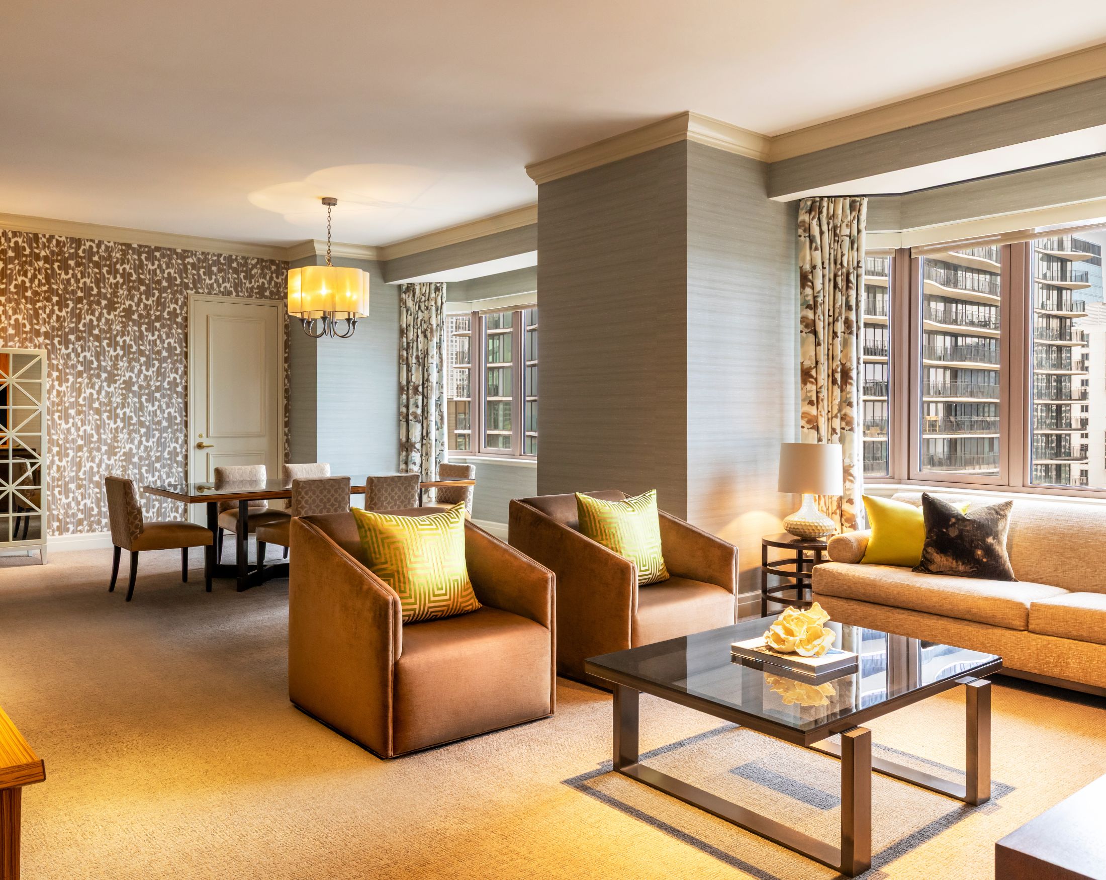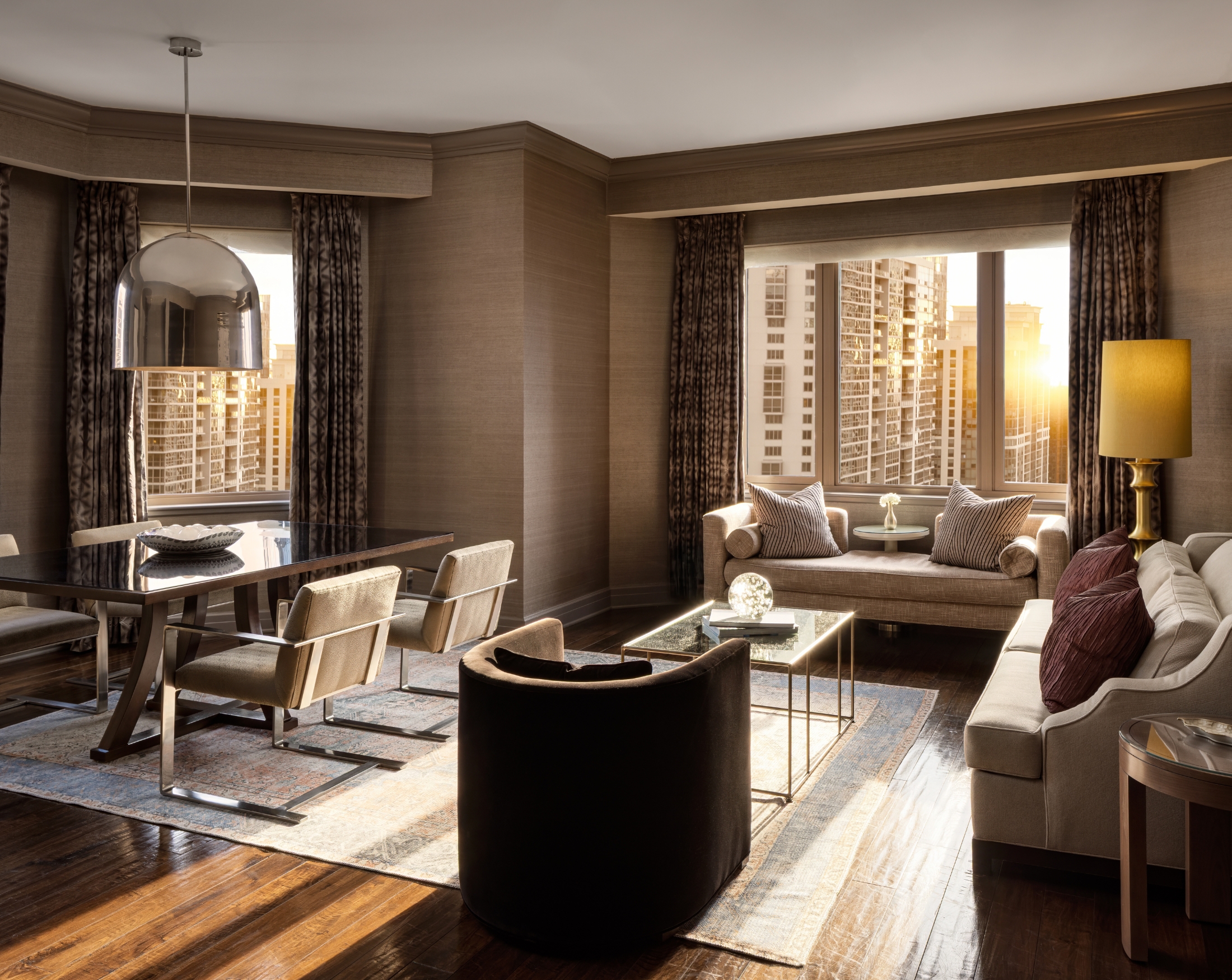 A private sanctuary awaits you in the Grant Park Suite. Ideal for an intimate dinner party or romantic weekend away and nestled away on the 37th Floor, Grant Park Suite guests enjoy lovely city views, a glorious marble bathroom with walk in shower and water closet. This suite includes Fairmont Gold access.