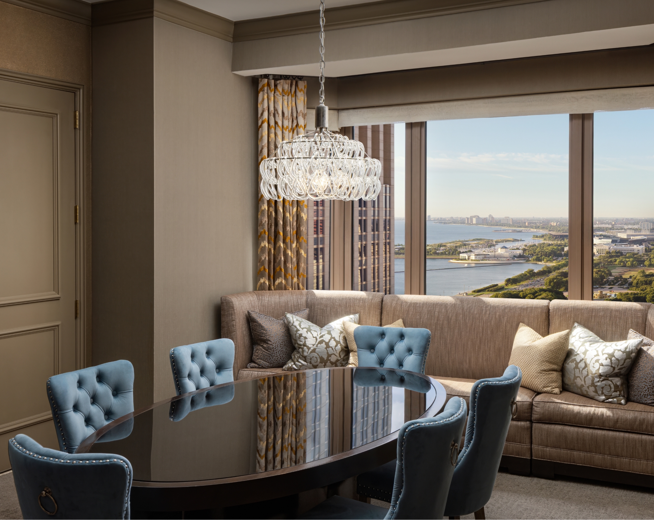 The Presidential Suite offers sweeping views of Chicago’s skyline and the Lake Michigan shoreline.